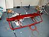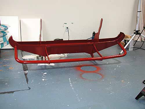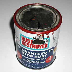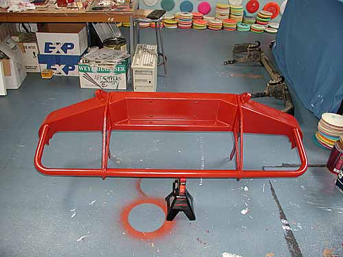 I used a brand of primer called Rust Destroyer for the first coat, which I applied with a brush. This stuff turned out to be very thick and rather har d to deal with, but it looks like a pretty tough product. I gave it two full days to completely dry before the final two coats of enamel. I assumed this stuff, being as thick as it was, would flow and even out like enamel, but after it dried there were some brush marks that didn't really disappear. Probably should have gone over it before it dried with a roller to even the surface out, but the primer coat turned out pretty good. The difficult part was standing the bumper up on the mounting brackets and supporting the front so I could paint the inside and the outside in one shot. I was careful to work the primer up into all the welds on the back side of the bumper to keep future rust problems to a minimum.