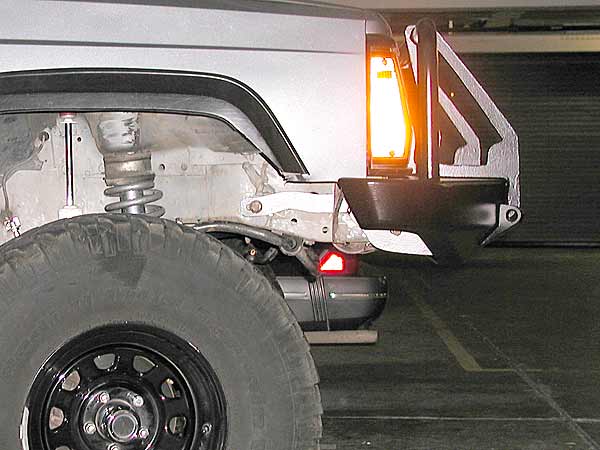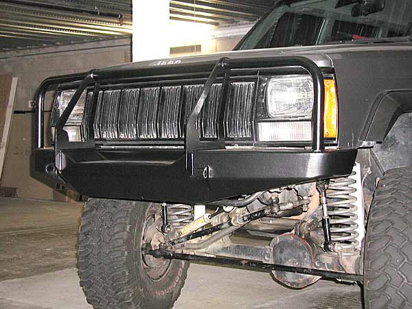 Installing the bumper was really a snap, because it fits like a factory part. In contrast to other stuff I've installed like my Custom 4x4 rear bumper, which required a bit of massaging to attach, and Rusty's skid plates, which didn't even line up properly and required drilling new holes and modifications to the mount bracketry, this thing was a piece of cake. As I mentioned, it mounts using the three nuts that are welded to the stock bumper bracket, and also incorporates a big bolt that runs all the way through the unibody "rail". The brackets are 1/4" plate and are attached to the inside of the bumper with about 8" of weld on either side. Should be plenty strong whether the pull is coming from directly in front of the Jeep or off to the side. Shackle tabs are laser cut and drilled out of 3/4" plate and welded all the way around to the front face of the bumper on either side of the grill guard. Grill guard is 1/2" laser cut steel plate, and extension tubes are 1.25" DOM tubing.