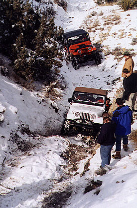 After playing around in the foothills for an hour, most of the group headed across the road to watch the hardcore wheelers tackle the first obstacle on Charlie's Trail. This trail follows a drainage that is very narrow and steep in spots. The pics below are of the waterfall and bump at the bottom. The recent snowfall made this an interesting scene to watch. Even with lockers front and rear and tall tires, the short wheel base CJ's had a tough time getting over the first rockpile. Longer rigs like Brett's and a pair of very flexy Toyota pickups made it look too easy. The short rigs smoked tires and came perilously close to slamming into the wall on the driver's side, and it just got worse with spinning tires. The first truck up was a big Blazer, open on both ends but chained on all four corners.