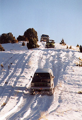 Near the upper end of the trail, there was a very steep off camber hill climb that everybody tried, as well as an even more difficult line off to the side that Gary in his monster Ford p-up blazed up with little trouble. I made it within 30 feet of the top on my second attempt, but had to take the strap from Mike to get all the way up. A big Bronco also took the really hard line, and made it on the second try with a little help. He ended up busting an axel or something shortly after. I had no idea at the time that there was a bypass, otherwise I might have taken it! A little further on, and about the time it was getting dark and very cold, we hit another steep climb. The blue Blazer had to get strapped by the other Blazer with chains after it got sideways on the hill and looked like it was near rolling. From here Gary's Ford blazed trail in some pretty deep powder. Those with chains made good progress, while those without chains or lockers relied on momentum and good driving to get by, as well as frequent strapping. Eventually, somebody with some brains suggested we turn around and head back before somebody really got stuck/busted. I remember backing the "hog" down about 1/8 of a mile in the dark, trying to stay in the 2-foot deep ruts so I wouldn't get stuck. Fun, but very tiring after the adrenaline buzz wore off.