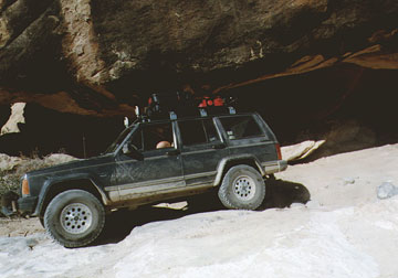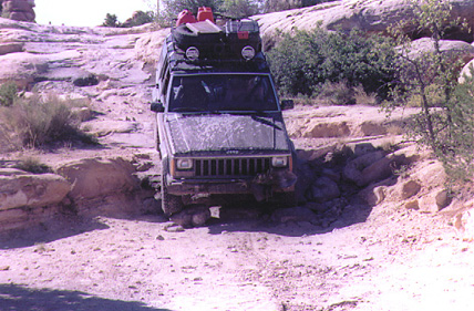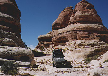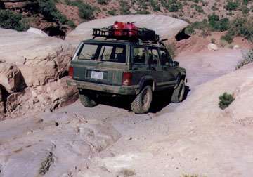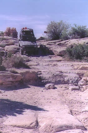 Elephant Hill in Canyonlands National Park (rated 3.5) was the first real trail I ran after lifting the Hog. Many would argue that with all the concrete, Elephant Hill is not really much of a challenge, but for someone with very little trail experience, it proved to be plenty tough. The part that really got the adrenaline flowing was a hundred-foot long section called "squeeze play." You drive through a crack barely wider than your vehicle, taking a careful line to avoid knocking off side mirrors or worse. The last 30 feet tilts hard to the passenger side--I really was surprised to make it through without a scratch! It would be easier in a CJ or Samurai, but I can't imagine trying it in a full-size Blazer or Bronco. A stock vehicle should be able to negotiate Elephant Hill with careful driving, but vehicles with longer wheelbases may have a little trouble with approach and departure angles in spots. Scrapes and grinds from overhanging bumpers and trailer hitches are evident everywhere. Many of the more difficult sections look a lot worse than they are. One section on the back side requires negotiating a short section of trail in reverse but is no big deal technically.