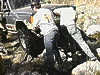 We turned around after going only a short way up the stream, but the short bit we did was a challenge to me and a lot of fun. Several of the group had to head back to civilization at that point, while John, Alan, Chris and I (and one other guy driving a white XJ, name I forget) drove on up to the top of another hill to have a little lunch and talk Jeeps. John has done some great stuff to his 2-door, including reinforcing the unibody and adding a beefy roll cage in the rear cargo area. After lunch we headed back to the parking lot to reconnect the sway bars (thanks JKS!!!) and air up before driving back to Berkeley.